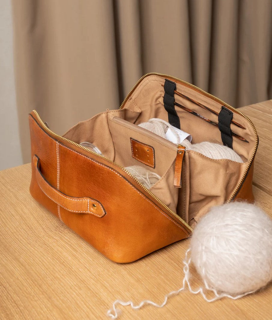 Project 9 is a small, curated beauty box style bag designed for yarn enthusiasts and knitting aficionados. Crafted with meticulous attention to detail, this chic and versatile bag is set to elevate your knitting experience to new heights. Discover the joy of organized creativity. With everything neatly arranged in your Project 9, you can spend more time knitting and less time searching for your supplies. - A dedicated section for knitting tools ensures that your scissors, stitch markers, and needles have a secure and organized home. Never lose a needle again, thanks to thoughtfully designed pockets and loops. Let the beauty of your project shine through without the clutter.
