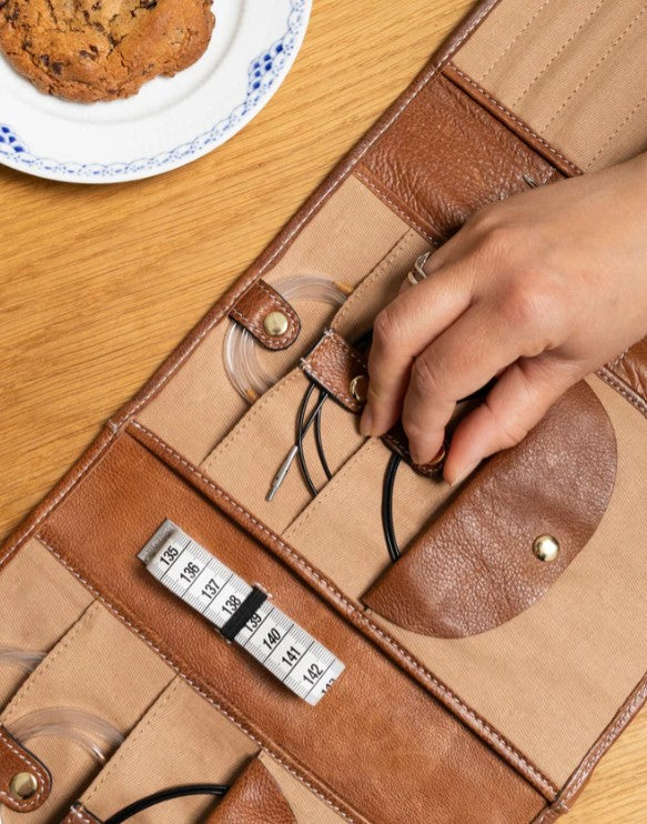 PROJECT 14 is our XL needle case for organizing your interchangeable circular knitting needles. It features 6 pockets with snap closures to securely hold your wires. Behind these pockets, there are open compartments where you can store knitting patterns or similar items. An elastic band allows you to keep your measuring tape handy, and there are 6 holes in the leather to accommodate 3 needles. A total of 18 slim pockets for knitting tips, crochet hooks of stocking needles, keeps them organized. Finally, you have 2 small pockets with flap and button closure where you can store your scissor and other loose knitting accessories. The entire needle case elegantly folds together and fastens with a snap, making it easy to carry your essential knitting tools.